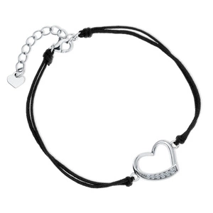 Srebrna pr.925 bransoletka z podwójnym czarnym sznurkiem - serce z cyrkoniami