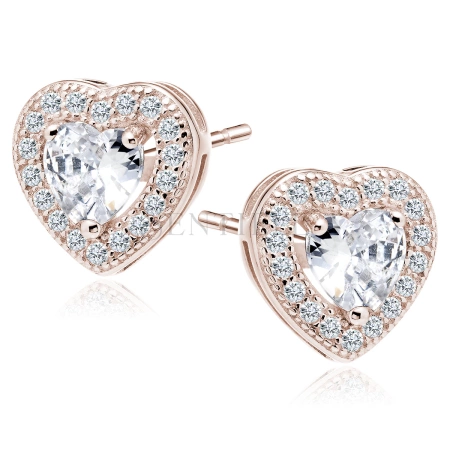 Srebrne kolczyki pr.925 Cyrkonia biała - serca - różowe złoto