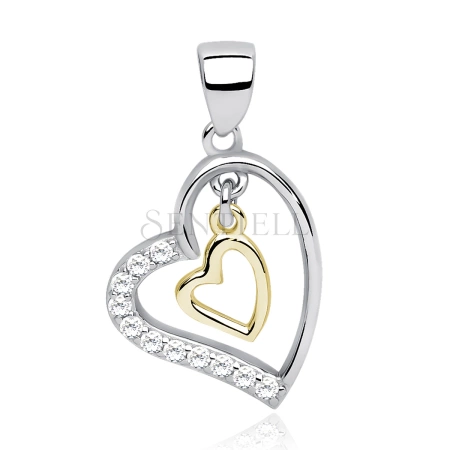 Srebrna zawieszka pr.925 wiszące pozłacane serce w serduszku z cyrkoniamii