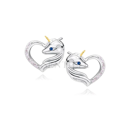 Srebrne kolczyki pr. 925 serce - jednorożec z jasnoróżowymi cyrkoniami i szafirowym okiem