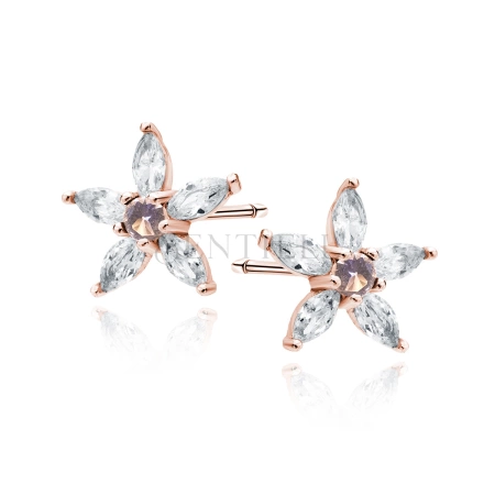 Srebrne pozłacane kolczyki pr.925 kwiatek z cyrkonią w kolorze morganitu - różowe złoto