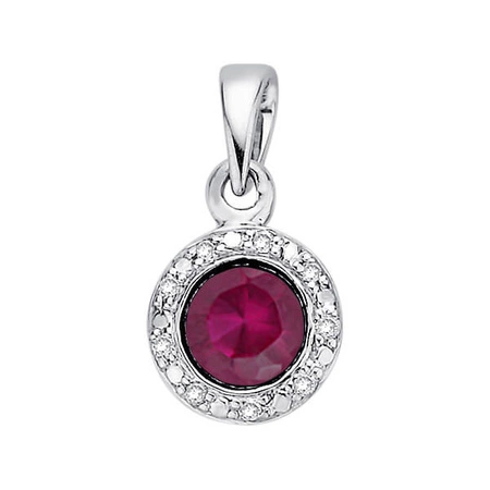 Dostępny na zamówienie, czas realizacji ok. 4 tygodnie Staviori Wisiorek. 9 Diamentów, szlif brylantowy, masa 0,04 ct., barwa H, czystość SI2. 1 Rubin, masa 0,50 ct.. Białe Złoto 0,585. Średnica 6,2 mm. Długość 11 mm.