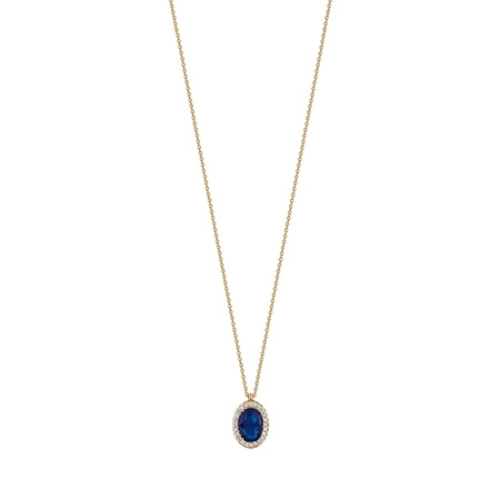 Dostępny na zamówienie, czas realizacji ok. 2 tygodnie Staviori Naszyjnik 42cm. 22 Diamenty, szlif brylantowy, masa 0,06 ct., barwa G, czystość VS2-SI1. 1 Szafir, masa 0,45 ct.. Żółte Złoto 0,750. Długość 8 mm. Szerokość 6 mm.