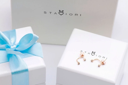 Staviori Kolczyki. 4 Diamenty, szlif brylantowy, masa 0,10 ct., barwa H, czystość I1. Różowe Złoto 0,585. Długość 11 mm. Średnica 2 mm. Niezwykłe, stylowe kolczyki z najmodniejszego, różowego złota. Składają się z dwóch elementów, które można nosić razem lub osobno. Piękno, styl i włoski design czystej postaci.
