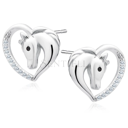 Srebrne kolczyki pr.925 serce - koń z czarnym okiem i białymi cyrkoniami