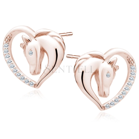 Srebrne pozłacane kolczyki pr.925 serce - koń z białymi cyrkoniami - różowe złoto