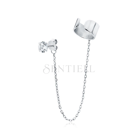 Srebrne kolczyki pr.925 z białą cyrkonią i nausznicą na łańcuszku