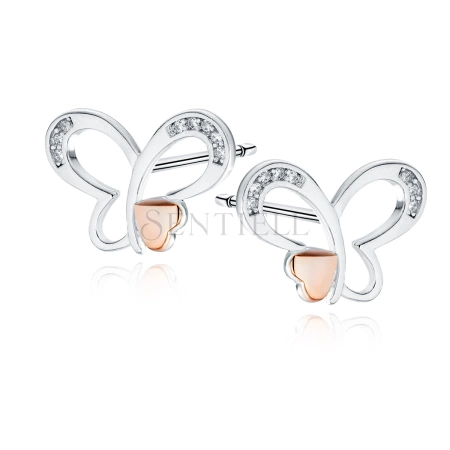 Srebrne kolczyki pr.925 motylki z sercem pozłacanym różowym złotem i białymi cyrkoniami