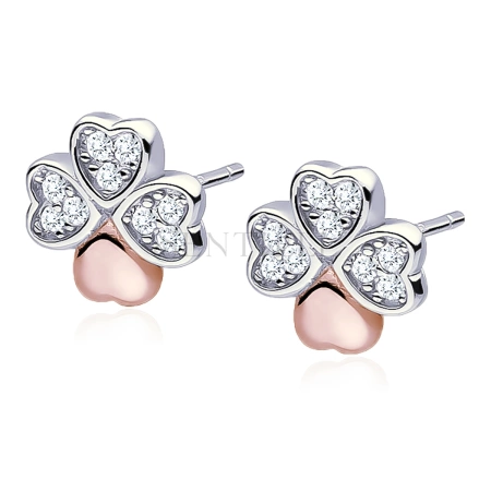 Srebrne kolczyki pr. 925 koniczynki z cyrkoniami, pozłacany na różowo listek