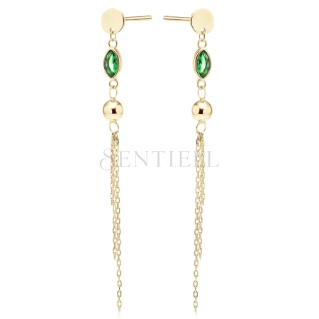 Srebrne pozłacane kolczyki pr. 925 ze szmaragdową cyrkonią, kulką i łańcuszkami
