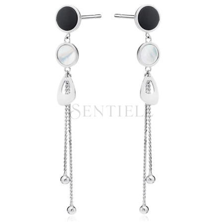 Srebrne kolczyki pr.925 - łańcuszki zakończone kulkami, czarny onyks i masa perłowa