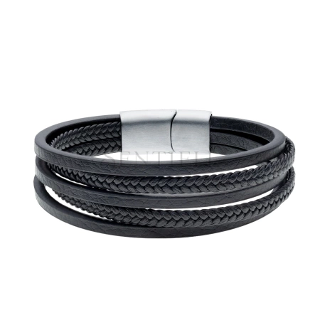 Męska Bransoletka ze Stali Szlachetnej z Plecionymi i Gładkimi Skórzanymi Paskami