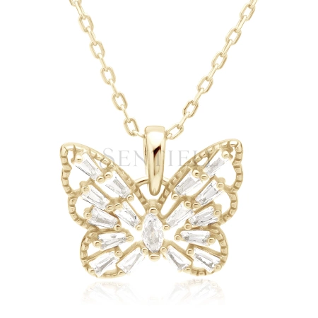 - Wyrafinowany srebrny naszyjnik w żółtym złocie 14K z motylem i białą cyrkonią. Idealny upominek dla bliskiej osoby.
