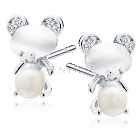 Srebrne kolczyki pr. 925 - miś z białymi cyrkoniami, uleksytem i perłami