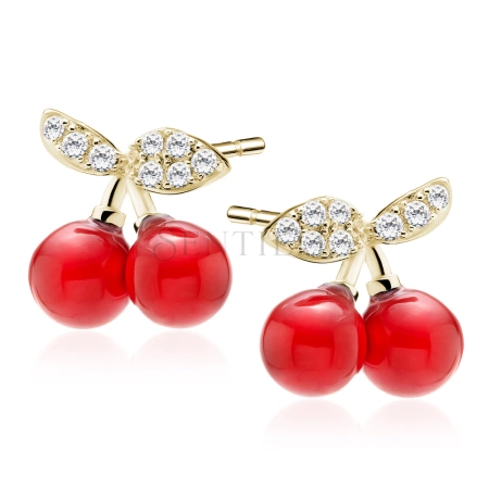 - Srebrne, pozłacane kolczyki pr. 925 - wiśnia z białymi cyrkoniami i czerwoną perełką