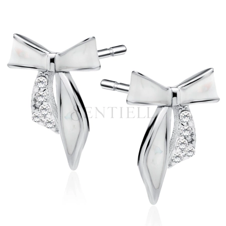 Srebrne kolczyki pr.925 emaliowane białe kokardki z białymi cyrkoniami