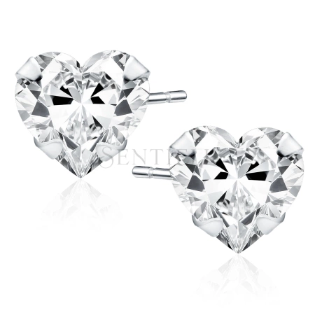 Srebrne, rodowane kolczyki pr.925 cyrkonia biała 6 x 6mm serduszka