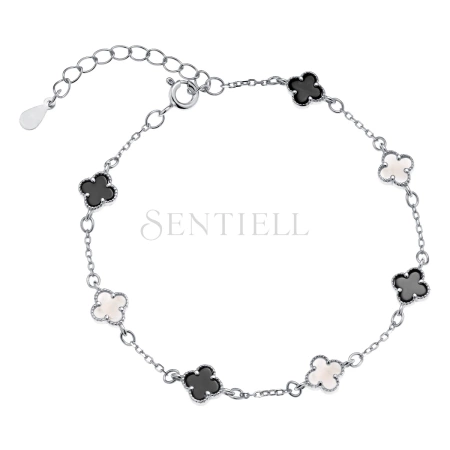 Srebrna bransoletka pr.925 z czarnym onyksem i masą perłową - czterolistna koniczynka