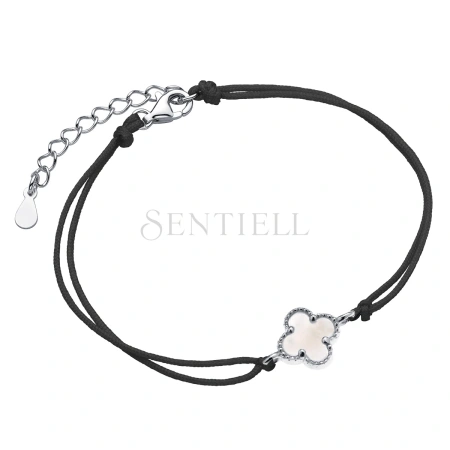 Srebrna bransoletka pr.925 z masą perłową i czarnym sznurkiem - czterolistna koniczynka