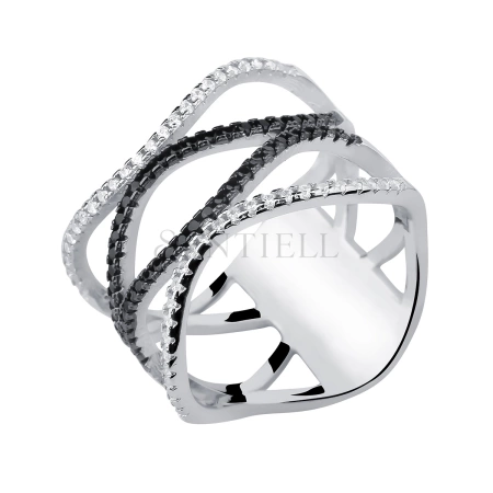 Srebrny, duży pierścionek falowany pr.925 cyrkonia biała i czarna