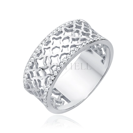 Srebrny pierścionek pr.925 z białymi cyrkoniami - ażurowy wzór zwieńczony rzędami cyrkonii