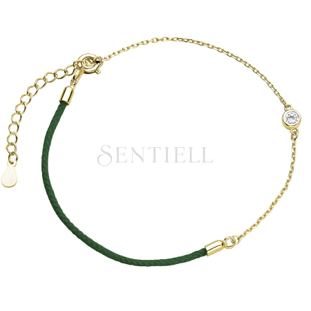 Srebrna pr.925 pozłacana bransoletka z ciemnozielonym sznurkiem i cyrkonią