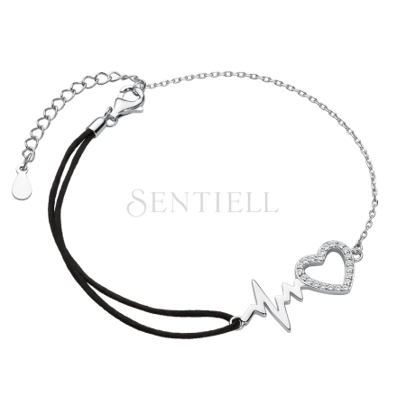 Srebrna pr.925 bransoletka z czarnym sznurkiem - serce z cyrkoniami i linia pulsu