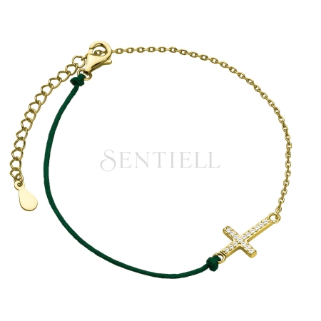 Srebrna pr.925 bransoletka z ciemnozielonym sznurkiem - pozłacany krzyżyk z cyrkoniami